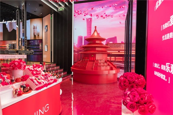 从老北京核心地标王府井大街推门而入,漫天飞舞的玫瑰、小黑瓶装点的6米铁塔、口红装点的中式风格天坛瞬间惊艳双眼。置身娇艳欲滴的玫瑰鲜花之中,顾客不仅可以遍览琳琅满目的兰蔻护肤、彩妆、香水的最热产品,更能够悠赏窗外古朴与时髦交织的新京城景致,在这里感受沉浸式“穿越”体验,碰撞出别样灵感。